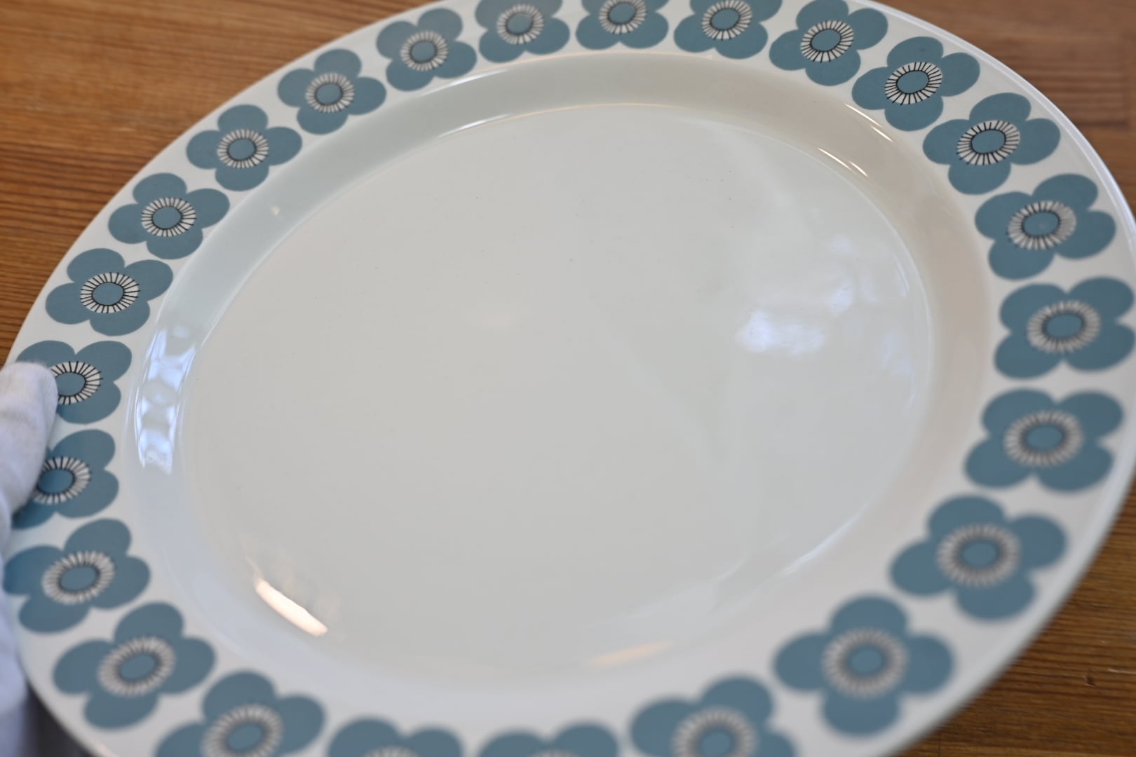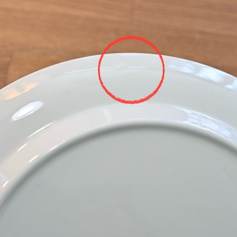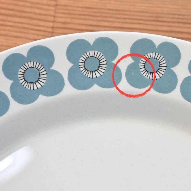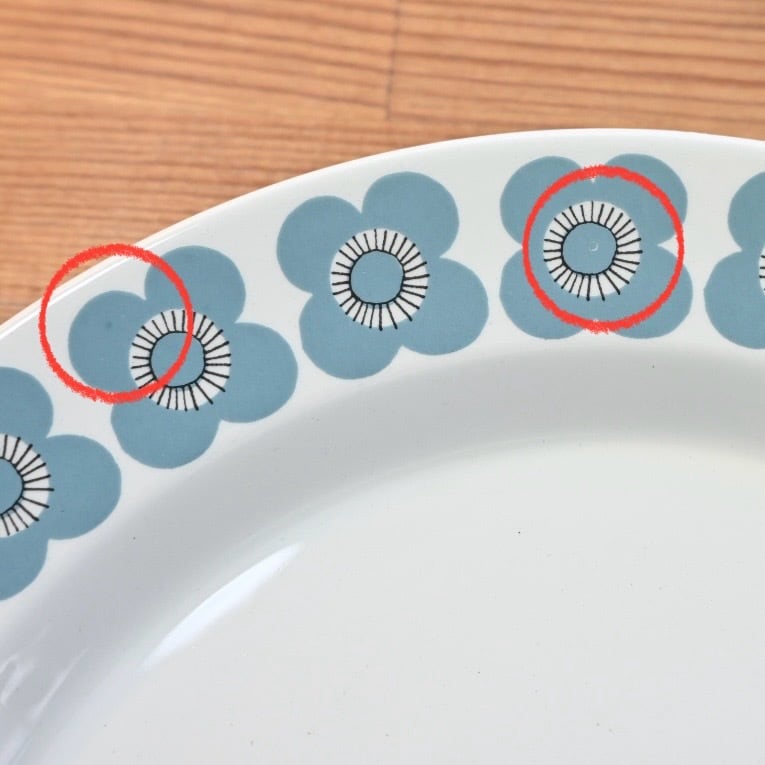 釉薬の上にプリントがされる製造方法のようで、プリントロスや色褪せが発生しやすいシリーズでもあります。プレート中央の平面部分の歪みも見えやすいと言えます。