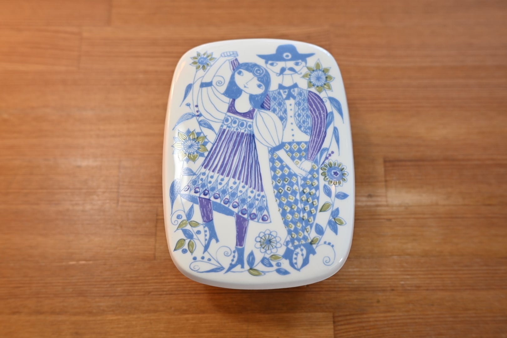 蓋には草花の中で男女が踊っている様子が細かく描かれており、本体縁部分にも可愛らしい模様が取り囲んであります。
