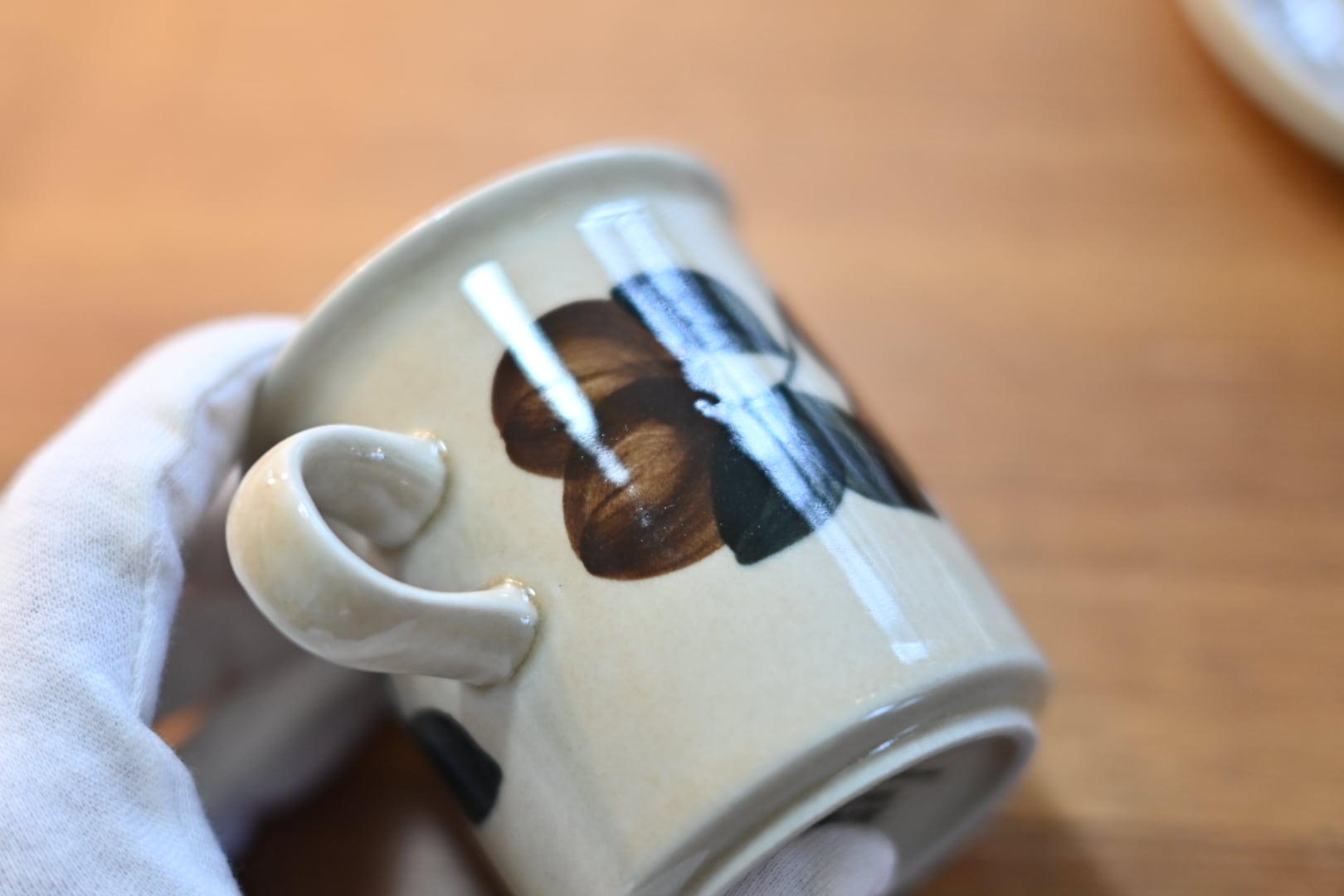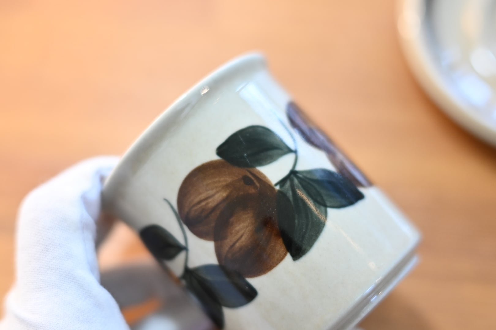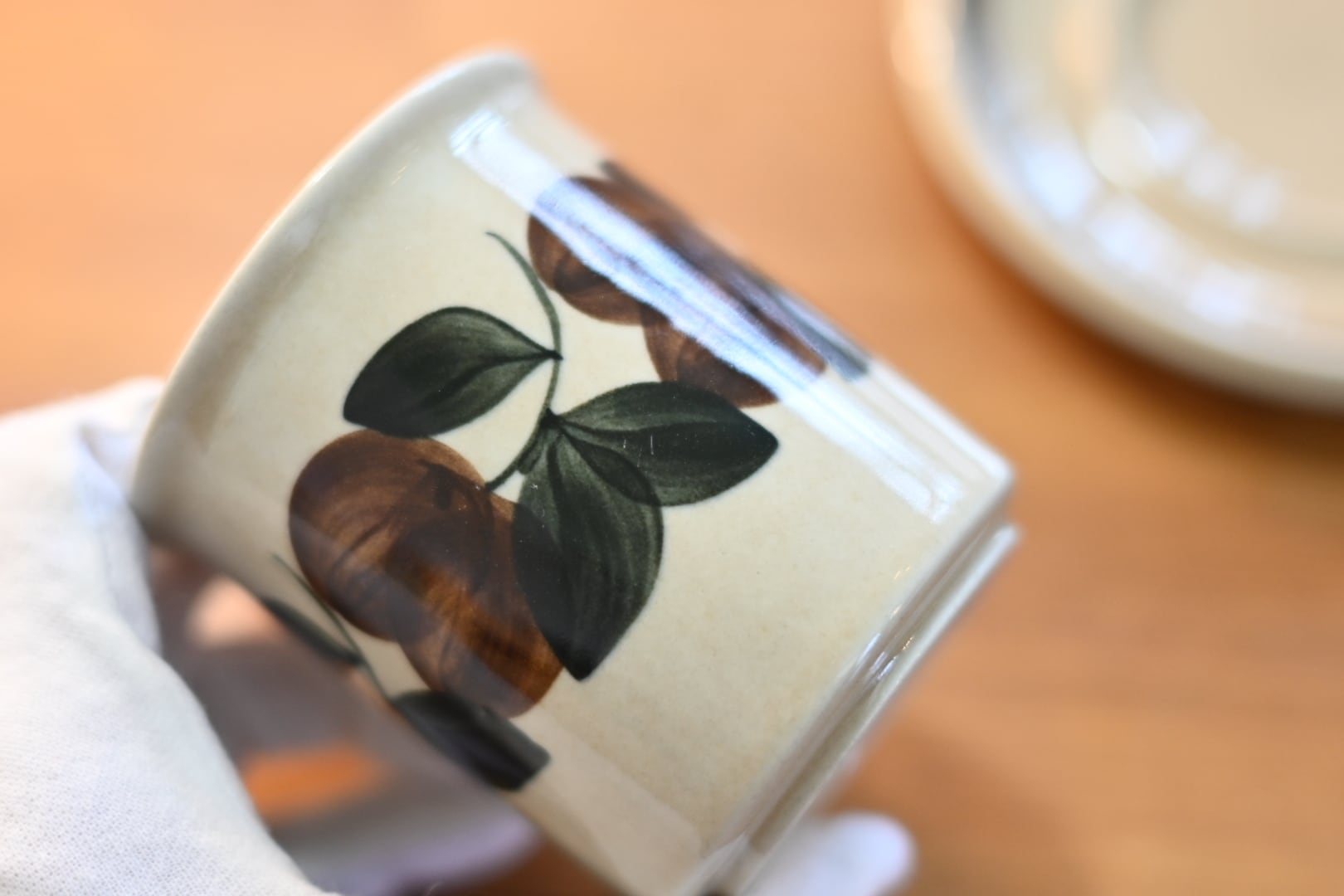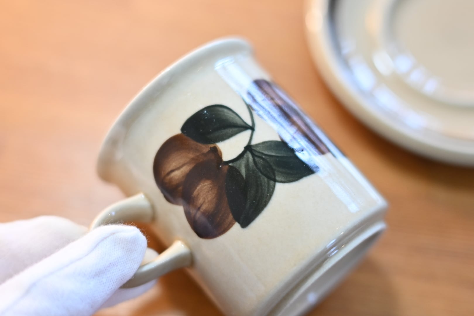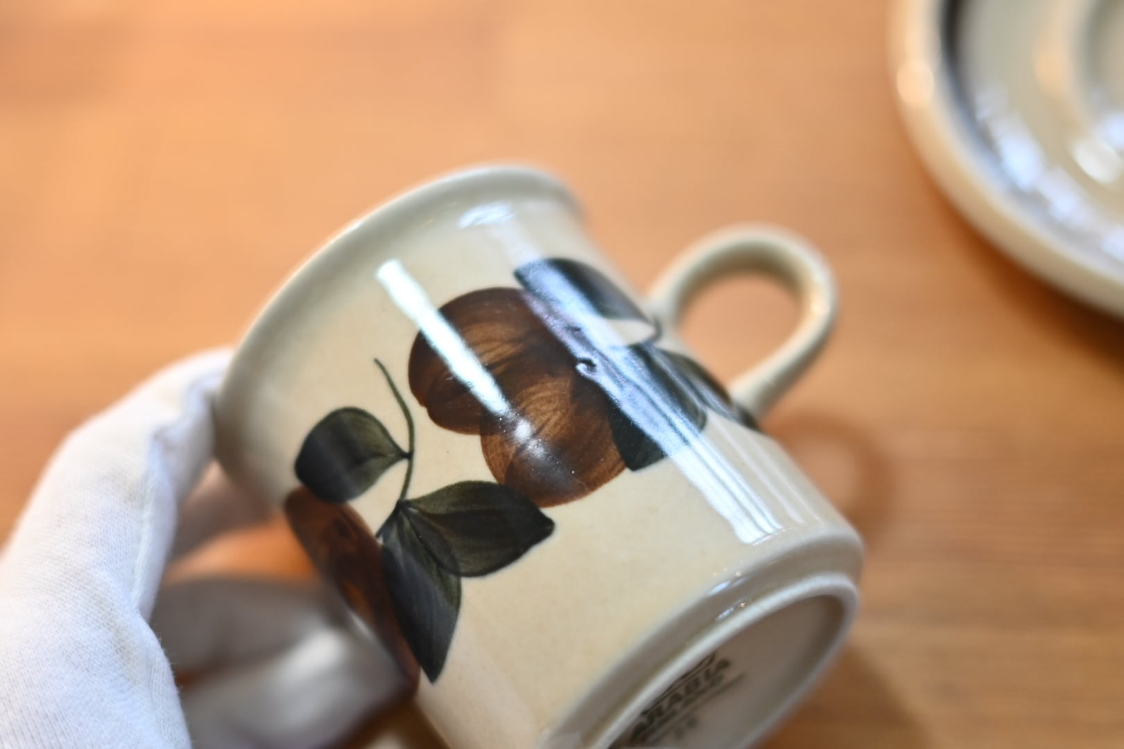 カップの側面には葉っぱや木の実の模様が優しげに描き上げられています。