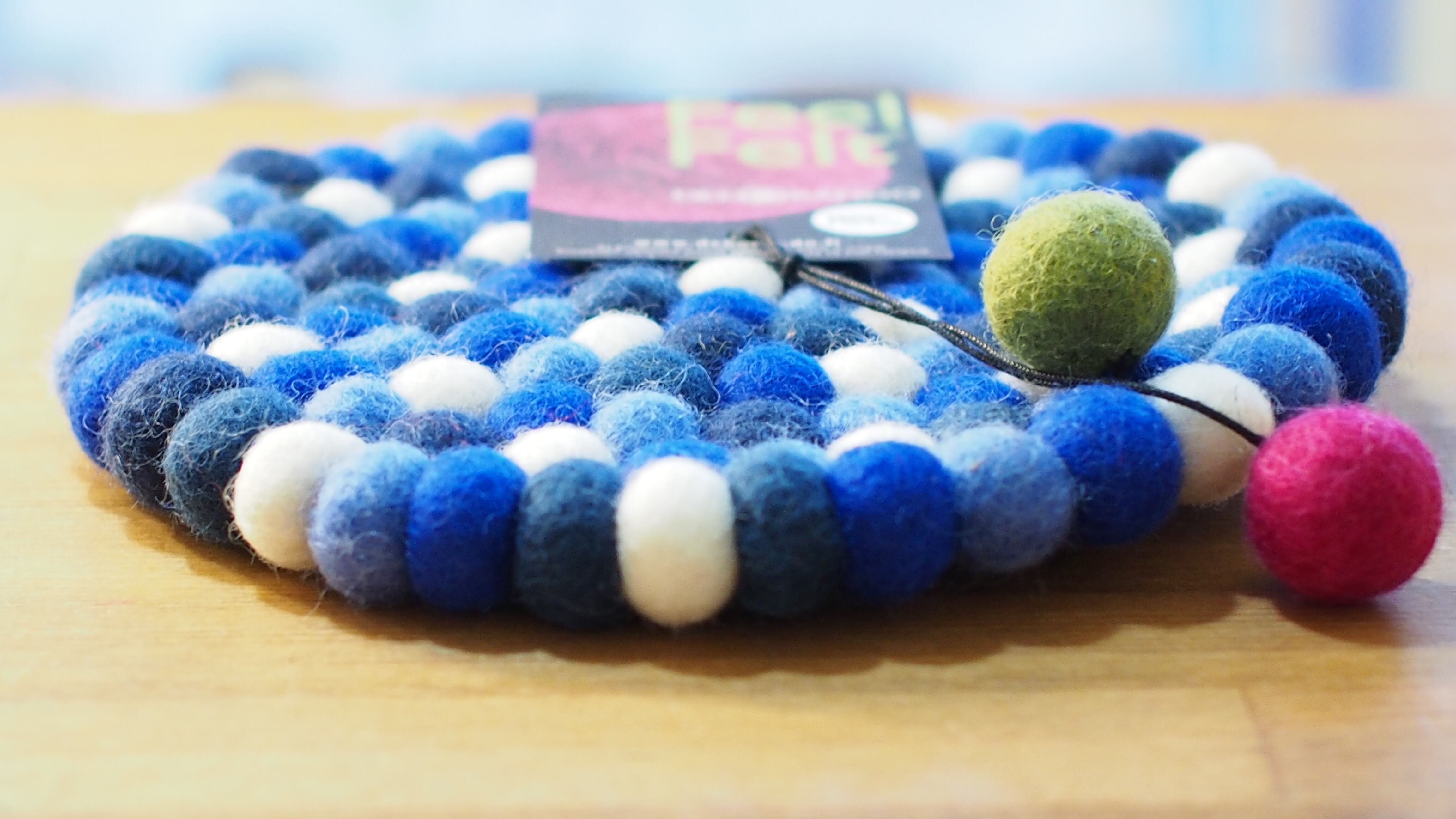 一つ一つたっぷりのピュアウールをぎゅっと丸めて作られた1.5cmのフェルトボールを組み合わせた ポットマット。耐熱、耐久性に優れ、使いやすさを追求したデザインです。毎日使うものだから、シン プルに。丁寧にハンドメイドで作られた良質なアイテムは大切な人への贈り物にもぴったりです。