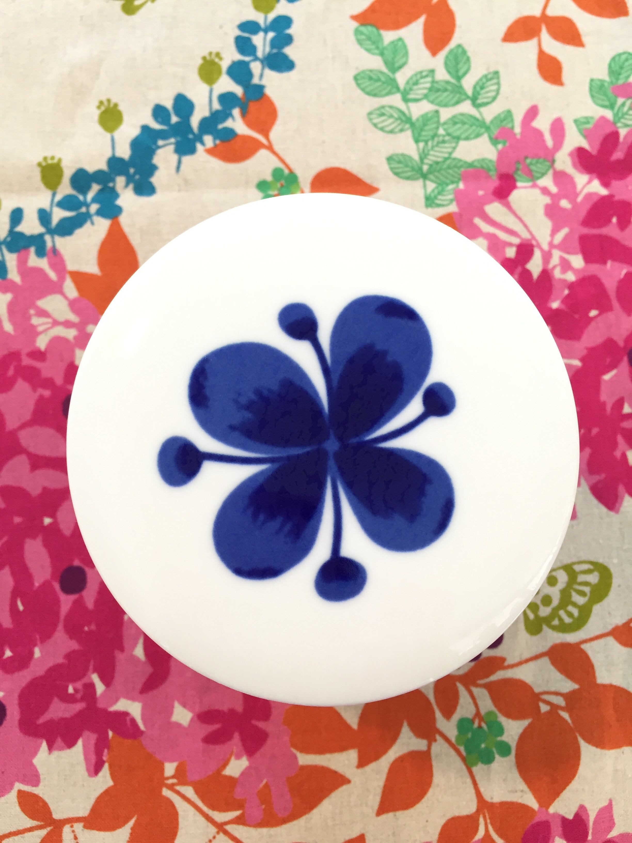 ブルーのお花のワンポイントの蓋が付いた大きなジャーはお気に入りのシュシュ、キャンディーやクッキーなど入れて近くに置いておいても楽しいですね。