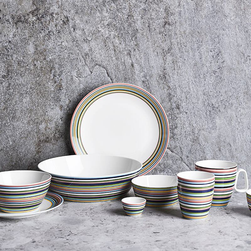 整ったリズミカルなストライプ模様が目を惹くオリゴは、あらゆるテーブルセッティングのアクセントになります。ストライプに様々な色が使われているので、ティーマなどの他のイッタラのテーブルウェアとも好相性。また、シンプルなフォルムは時代を超えたデザインの代表といえるでしょう。