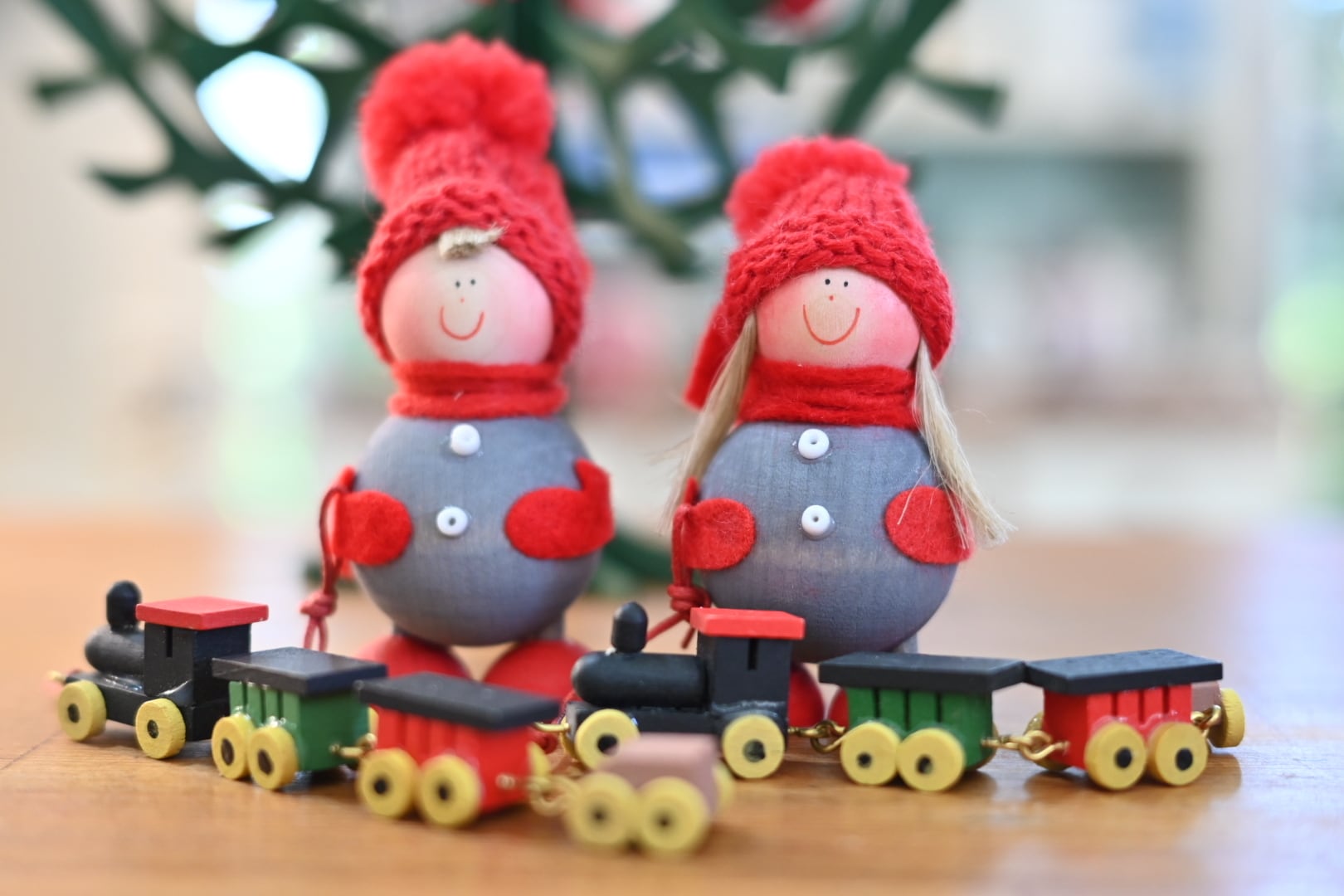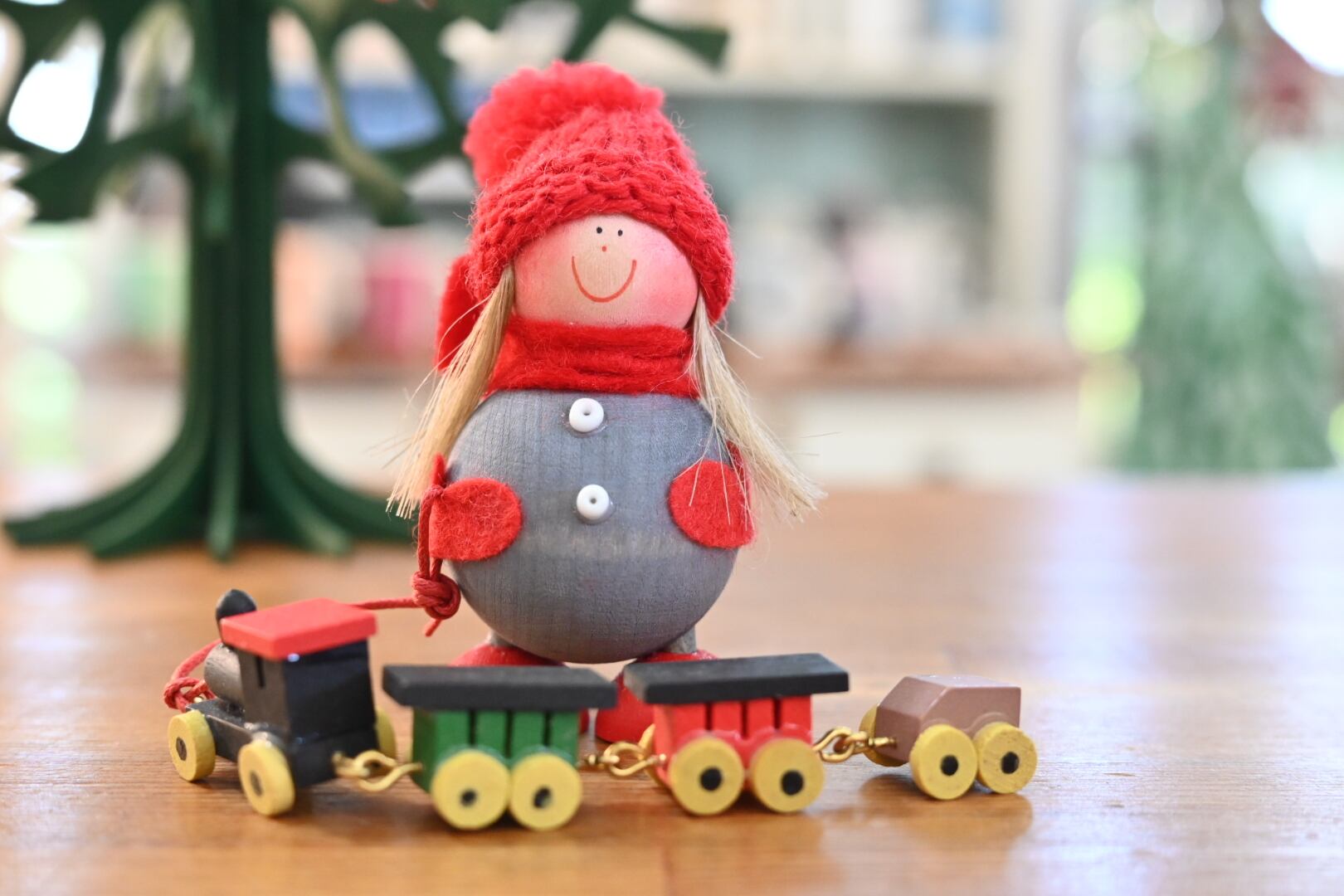 小さな汽車のおもちゃをひっぱる可愛らしいトントゥです。